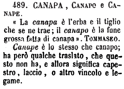 Canapa, Canapo e Canape - «La canapa è l'erba e il tiglio che se ne trae; il canapo è la fune grossa fatta di canapa». Tommaseo.