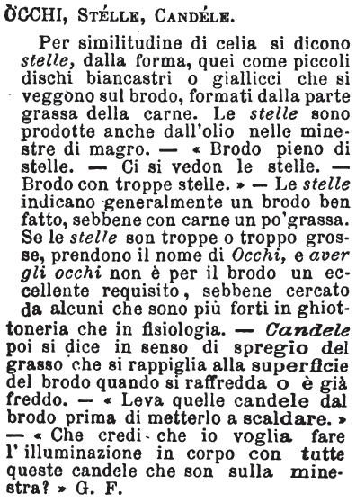 Occhi, Stelle, Candele - Per similitudine di celia si dicono stelle, dalla forma, quei come piccoli dischi biancastri o giallicci che si veggono sul brodo, formati dalla parte grassa della carne. Le stelle sono prodotte anche dall'olio nelle minestre di magro. - «Brodo pieno di stelle. - Ci si vedon le stelle. - Brodo con troppe stelle.» - Le stelle indicano generalmente un brodo ben fatto, sebbene con carne un po' grassa. Se le stelle son troppe o troppo grosse, prendono il nome di Occhi, e aver gli occhi non è per il brodo un eccellente requisito, sebbene cercato da alcuni che sono più forti in ghiottoneria che in fisiologia. - Candele poi si dice in senso di spregio del grasso che si rappiglia alla superficie del brodo quando si raffredda o è già freddo. - «Leva quelle candele dal brodo prima di metterlo a scaldare.» - «Che credi che io voglia fare l'illuminazione in corpo con tutte queste candele che son sulla minestra?» G. F. [immagine]