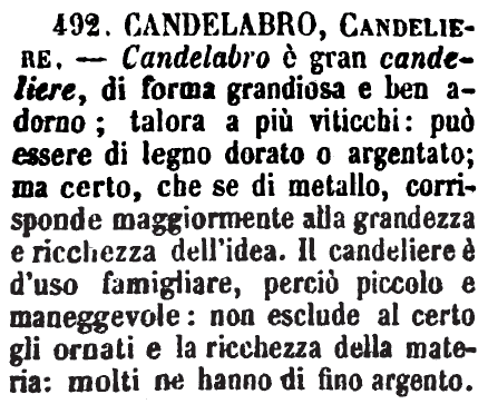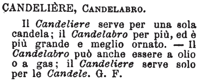 Candeliere, Candelabro - Il Candeliere serve per una sola candela; il Candelabro per più, ed è più grande e meglio ornato. - Il Candelabro può anche essere a olio o a gas; il Candeliere serve solo per le Candele. G. F. [immagine]