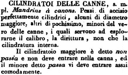 Il cilindratoio maggiore è detto non passa e non deve entrare nella canna, ed il minore detto passa vi deve entrare assai comodamente. [immagine] |