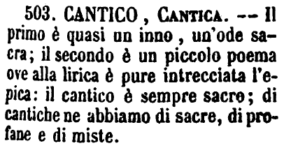 Cantico, Cantica - Il primo è quasi un inno, un'ode sacra; il secondo è un piccolo poema ove alla lirica è pure intrecciata l'epica: il cantico è sempre sacro; di cantiche ne abbiamo di sacre, di profane e di miste. [immagine]