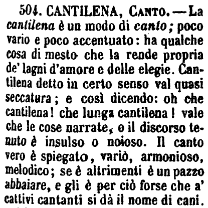 | Cantilena, Canto - La cantilena è un modo di canto; poco vario e poco accentuato: ha qualche cosa di mesto che la rende propria de' lagni d'amore e delle elegie. Cantilena detto in certo senso val quasi seccatura; e così dicendo: oh che cantilena! che lunga cantilena! vale che le cose narrate, o il discorso tenuto è insulso o noioso. Il canto vero è spiegato, vario, armonioso, melodico; se è altrimenti è un pazzo abbaiare, e gli è per ciò forse che a' cattivi cantanti si dà il nome di cani. [immagine] |