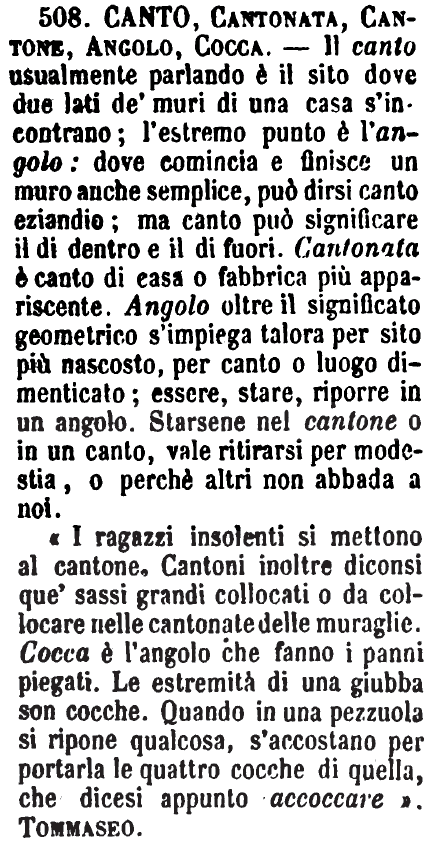 Canto, Cantonata, Cantone, Angolo, Cocca - Il canto usualmente parlando è il sito dove due lati de' muri di una casa s'incontrano; l'estremo punto è l'angolo: dove comincia e finisce un muro anche semplice, può dirsi canto eziandio; ma canto può significare il di dentro e il di fuori. Cantonata è canto di casa o fabbrica più appariscente. Angolo oltre il significato geometrico s'impiega talora per sito più nascosto, per canto o luogo dimenticato; essere, stare, riporre in un angolo. Starsene nel cantone o in un canto, vale ritirarsi per modestia, o perchè altri non abbada a noi.