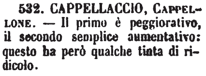 Cappellaccio, Cappellone - Il primo è peggiorativo, il secondo semplice aumentativo: questo ha però qualche tinta di ridicolo. [immagine]