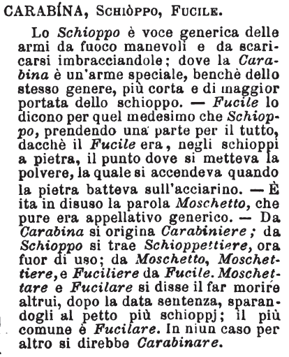 Carabina, Schioppo, Fucile - Lo Schioppo è voce generica delle armi da fuoco manevoli e da scaricarsi imbracciandole: dove la Carabina è un'arme speciale, benché dello stesso genere, più corta e di maggior portata dello schioppo. - Fucile lo dicono per quel medesimo che Schioppo, prendendo una parte per il tutto, dacché il Fucile era, negli schioppi a pietra, il punto dove si metteva la polvere, la quale si accendeva quando la pietra batteva sull'acciarino. - È ita in disuso la parola Moschetto, che pure era appellativo generico. - Da Carabina si origina Carabiniere; da Schioppo si trae Schioppettiere, ora fuor di uso; da Moschetto, Moschettiere, e Fuciliere da Fucile. Moschettare e Fucilare si disse il far morire altrui, dopo la data sentenza, sparandogli al petto più schioppj; il più comune è Fucilare. In niun caso per altro si direbbe Carabinare. [immagine]