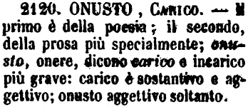 | Onusto, Carico - Il primo è della poesia; il secondo, della prosa più specialmente; onusto, onere, dicono carico e incarico più grave: carico è sostantivo e aggettivo; onusto aggettivo soltanto. [immagine] |