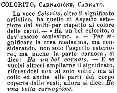 | Colorito, Carnagione, Carnato - La voce Colorito, oltre il significato artistico, ha quello di Aspetto esteriore del volto per rispetto al colore delle carni. - «Ha un bel colorito, e dev'essere sanissimo.» - Per significare la cosa medesima, ma considerando, non solo l'aspetto esteriore, ma anche la parte carnosa, si dice: Ha un bel carnato. - E se vuolsi altresì ampliarne il significato, riferendosi non al solo volto, ma al collo ed anche alle parti del corpo coperte dalle vesti, allora si dice: Ha una bella carnagione. [immagine] |
