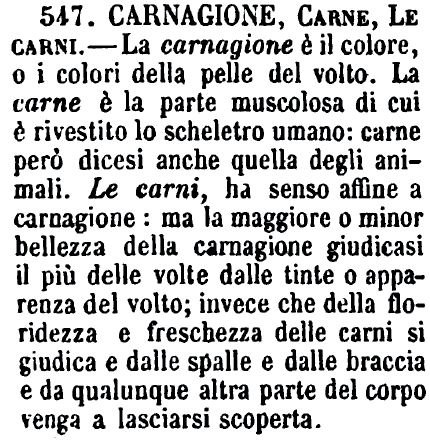| Carnagione, Carne, Le carni - La carnagione è il colore, o i colori della pelle del volto. La carne è la parte muscolosa di cui è rivestito lo scheletro umano: carne però dicesi anche quella degli animali. Le carni, ha senso affine a carnagione: ma la maggiore o minor bellezza della carnagione giudicasi il più delle volte dalle tinte o apparenza del volto; invece che dalla floridezza e freschezza delle carni si giudica e dalle spalle e dalle braccia e da qualunque altra parte del corpo venga a lasciarsi scoperta. [immagine] |
