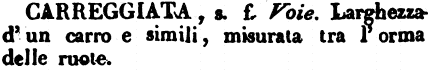 | Carreggiata - s. f. Voie. Larghezza d'un carro e simili, misurata tra l'orma delle ruote. [immagine] |