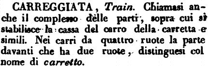 | Carreggiata - Train. Chiamasi anche il complesso delle parti, sopra cui si stabilisce la cassa del carro della carretta e simili. Nei carri da quattro ruote la parte davanti che ha due ruote, distinguesi col nome di carretto. [immagine] |