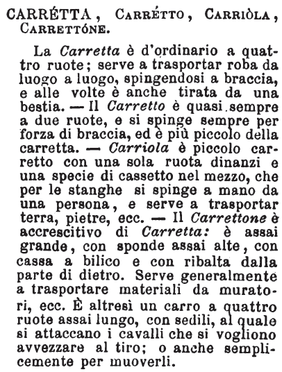 | Carretta, Carretto, Carrettone, Carruccio, Carroccio - «La carretta è più grande, tirata per lo più da animali: il carretto per lo più a mano. La carretta può essere a quattro ruote; il carretto ne ha due. Carrettone è accrescitivo di carretta e non di carretto: ed è quella specie di carro che serve per domare ed esercitare i cavalli. Poi carrettoni si dicono quelle grandi carrette che servono a portar via le immondizie dalle strade. Carruccio è quell'arnese di legno con quattro girelle ove si mettono i bambini perché imparino ad andare». Tommaseo.