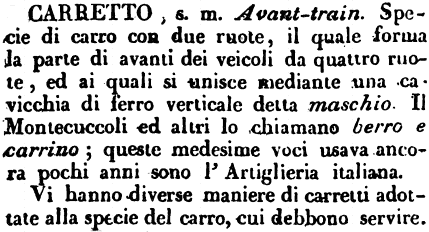 Carretto - s. m. Avant-train. Specie di carro con due ruote, il quale forma la parte di avanti dei veicoli da quattro ruote, ed ai quali si unisce mediante una cavicchia di ferro verticale detta maschio. Il Montecuccoli ed altri lo chiamano berro e carrino; queste medesime voci usava ancora pochi anni sono l'Artiglieria italiana.