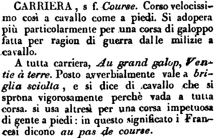 | Carriera - s. f. Course. Corso velocissimo così a cavallo come a piedi. Si adopera più particolarmente per una corsa di galoppo fatta per ragion di guerra dalle milizie a cavallo.