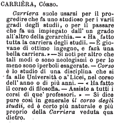 | Carriera, Corso - Carriera suole usarsi per il progredire che fa uno studioso per i varii gradi degli studii, o per il passare che fa un impiegato dall'un grado all'altro della gerarchia. - «Ha fatto tutta la carriera degli studii. - E' giovane di ottimo ingegno, e farà una bella carriera.» - Si noti per altro che tali modi o sono neologismi o per lo meno sono iperboli esagerate. - Corso è lo studio di una disciplina che si fa alle Università o a' Licei, nel corso dell'anno o di più anni. - «Ha fatto il corso di filosofia. - Assiste a tutti i corsi di que' professori.» - Si dice pure così in generale il corso degli studii, ed è certo più naturale e più proprio della Carriera veduta qua dietro. [immagine] |