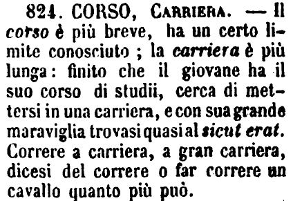 | Corso, Carriera - Il corso è più breve, ha un certo limite conosciuto; la carriera è più lunga: finito che il giovane ha il suo corso di studii, cerca di mettersi in una carriera, e con sua grande maraviglia trovasi quasi al sicut erat.
