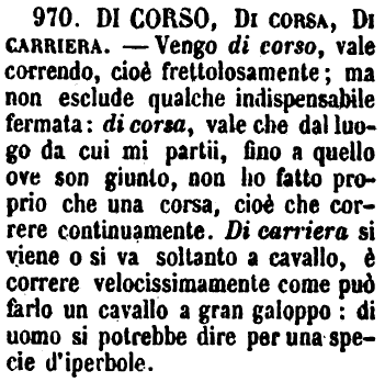 | Di corso, Di corsa, Di carriera - Vengo di corso, vale correndo, cioè frettolosamente; ma non esclude qualche indispensabile fermata: di corsa, vale che dal luogo da cui mi partii, fino a quello ove son giunto, non ho fatto proprio che una corsa, cioè che correre continuamente. Di carriera si viene o si va soltanto a cavallo, è correre velocissimamente come può farlo un cavallo a gran galoppo: di uomo si potrebbe dire per una specie di iperbole. [immagine] |