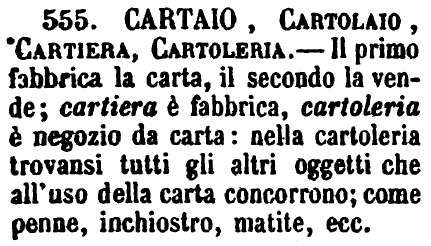 | Cartaio, Cartolaio, Cartiera, Cartoleria - Il primo fabbrica la carta, il secondo la vende; cartiera è fabbrica, cartoleria è negozio da carta: nella cartoleria trovansi tutti gli altri oggetti che all'uso della carta concorrono; come penne, inchiostro, matite, ecc. [immagine] |