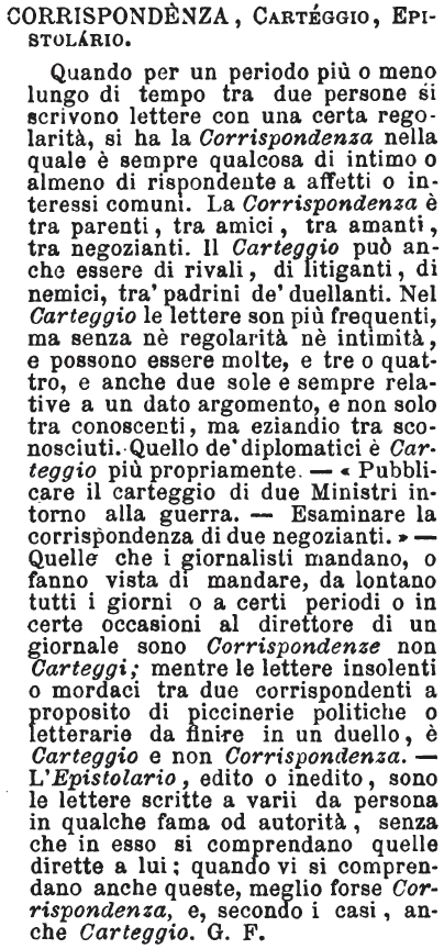 | Corrispondenza, Carteggio, Epistolario - Quando per un periodo più o meno lungo di tempo tra due persone si scrivono lettere con una certa regolarità, si ha la Corrispondenza nella quale è sempre qualcosa di intimo o almeno di rispondente a affetti o interessi comuni. La Corrispondenza è tra parenti, tra amici, tra amanti, tra negozianti. Il Carteggio può anche essere di rivali, dì litiganti, di nemici, tra' padrini de' duellanti. Nel Carteggio le lettere son più frequenti, ma senza nè regolarità nè intimità, e possono essere molte, e tre o quattro, e anche due sole e sempre relative a un dato argomento, e non solo tra conoscenti, ma eziandio tra sconosciuti. Quello de' diplomatici è Carteggio più propriamente. — « Pubblicare il carteggio di due Ministri intorno alla guerra. — Esaminare la corrispondenza di due negozianti. » — Quelle che i giornalisti mandano, o fanno vista di mandare, da lontano tutti i giorni o a certi periodi o in certe occasioni al direttore di un giornale sono Corrispondenze non Carteggi; mentre le lettere insolenti o mordaci tra due corrispondenti a proposito di piccinerie politiche o letterarie da finire in un duello, è Carteggio e non Corrispondenza. — L'Epistolario, edito o inedito, sono le lettere scritte a varii da persona in qualche fama od autorità, senza che in esso si comprendano quelle dirette a lui; quando vi si comprendano anche queste, meglio forse Corrispondenza, e, secondo i casi, anche Carteggio. G. F. [immagine] |