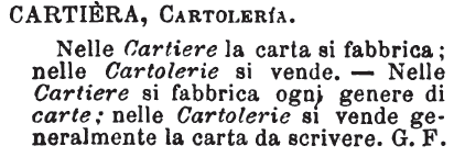 Cartiera, Cartoleria - Nelle Cartiere la carta si fabbrica; nelle Cartolerie si vende. - Nelle Cartiere si fabbrica ogni genere di carte; nelle Cartolerie si vende generalmente la carta da scrivere. G. F. [immagine]