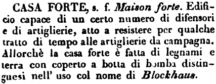Casa forte - s. f. Maison forte. Edificio capace di un certo numero di difensori e di artiglierie, atto a resistere per qualche tratto di tempo alle artiglierie da campagna. Allorchè la casa forte è fatta di legnami e terra con coperto a botta di bomba distinguesi nell'uso col nome di Blockhaus. [immagine]