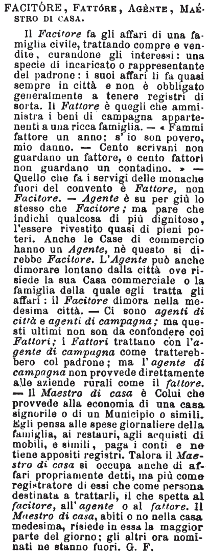 Facitore, Fattore, Agente, Maestro di casa - Il Facitore fa gli affari di una famiglia civile, trattando compre e vendite, curandone gli interessi: una specie di incaricato o rappresentante del padrone: i suoi affari li fa quasi sempre in città e non è obbligato generalmente a tenere registri di sorta. Il Fattore è quegli che amministra i beni di campagna appartenenti a una ricca famiglia. — « Fammi fattore un anno; s'io son povero, mio danno. — Cento scrivani non guardano un fattore, e cento fattori non guardano un contadino. » — Quello che fa i servigi delle monache fuori del convento è Fattore, non Facitore. — Agente è su per giù lo stesso che Facitore; ma pare che indichi qualcosa di più dignitoso, l'essere rivestito quasi di pieni poteri. Anche le Case di commercio hanno un Agente, né questo si direbbe Facitore. L'Agente può anche dimorare lontano dalla città ove risiede la sua Casa commerciale o la famiglia della quale egli tratta gli affari: il Facitore dimora nella medesima città. — Ci sono agenti di città e agenti di campagna; ma questi ultimi non son da confondere coi Fattori; i Fattori trattano con l'agente di campagna come tratterebbero col padrone; ma l'agente di campagna non provvede direttamente alle aziende rurali come il fattore. — Il Maestro di casa è Colui che provvede alla economia di una casa signorile o di un Municipio o simili. Egli pensa alle spese giornaliere della famiglia, ai restauri, agli acquisti di mobili, e simili, paga i conti e ne tiene appositi registri. Talora il Maestro di casa si occupa anche di affari propriamente detti, ma più come registratore di essi che come persona destinata a trattarli, il che spetta al facitore, all'agente o al fattore. Il Maestro di casa, abiti o no nella casa medesima, risiede in essa la maggior parte del giorno; gli altri ora nominati ne stanno fuori. G. F. [immagine]