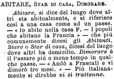 Abitare, Star di casa, Dimorare - Abitare, si dice del luogo dove altri sta abitualmente, e si riferisce così a una casa come ad un paese. - «Io abito nella casa F. - I popoli che abitano la Francia» - che più comunemente dicesi gli Abitanti. Stare o Star di casa, dicesi del luogo dove altri ha domicilio. Dimorare è il Passare più o meno tempo in qualche paese. - «Andò a Frascati e vi dimorò tre mesi.» - Più italianamente si direbbe vi si trattenne. [immagine]