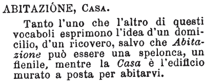 Abitazione, Casa - Tanto l'uno che l'altro di questi vocaboli esprimono l'idea d'un domicilio, d'un ricovero, salvo che Abitazione può essere una spelonca, un fienile, mentre la Casa è l'edificio murato a posta per abitarvi. [immagine]