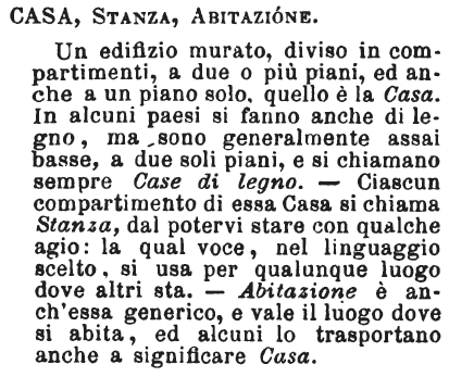 Casa, Stanza, Abitazione - Un edifizio murato, diviso in compartimenti, a due o più piani, ed anche a un piano solo, quello è la Casa. In alcuni paesi si fanno anche di legno, ma sono generalmente assai basse, a due soli piani, e si chiamano sempre Case di legno. - Ciascun compartimento di essa Casa si chiama Stanza, dal potervi stare con qualche agio: la qual voce, nel linguaggio scelto, si usa per qualunque luogo dove altri sta. - Abitazione è anch'essa generico, e vale il luogo dove si abita, ed alcuni lo trasportano anche a significare Casa. [immagine]