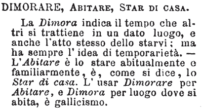 Dimorare, Abitare, Star di casa - La Dimora indica il tempo che altri si trattiene in un dato luogo, e anche l'atto stesso dello starvi; ma ha sempre l'idea di temporarietà. - L'Abitare è lo stare abitualmente e familiarmente, è, come si dice, lo Star di casa. L'usar Dimorare per Abitare, e Dimora per luogo dove si abita, è gallicismo. [immagine]