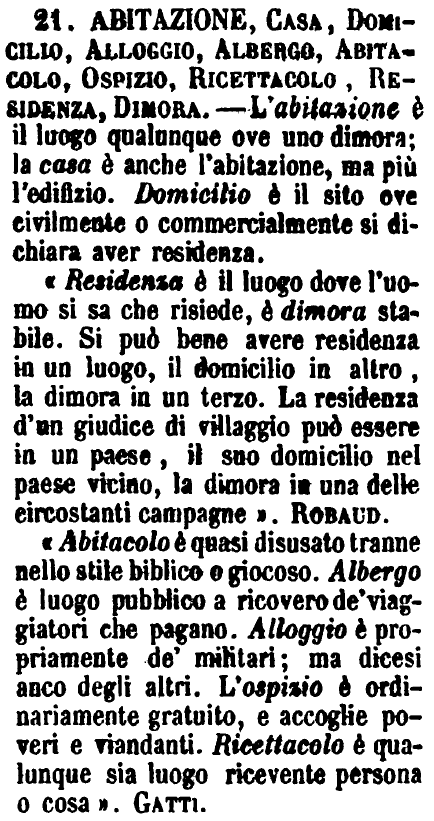 Abitazione, Casa, Domicilio, Alloggio, Albergo, Abitacolo, Ospizio, Ricettacolo, Residenza, Dimora - L'abitazione è il luogo qualunque ove uno dimora; la casa è anche l'abitazione, ma più l'edifizio. Domicilio è il sito ove civilmente o commercialmente si dichiara aver residenza.