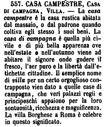 Casa campestre, Casa di campagna, Villa - La casa campestre è la casa rustica abitata dal massaio, o dal padrone quando coltiva egli stesso i suoi beni. La casa di campagna è quella più civile e di più bella apparenza ove nell'estate o nell'autunno viene ad abitare il signore onde godere il fresco, l'aer puro e la libertà dall'etichette cittadine. Il semplice nome di villa per un certo orgoglioso contrapposto vien dato a quelle case di campagna, che veri palazzi regii e principeschi appaiono per la loro sontuosità, ricchezza e magnificenza. La villa Borghese a Roma è celebre in questo significato. [immagine]