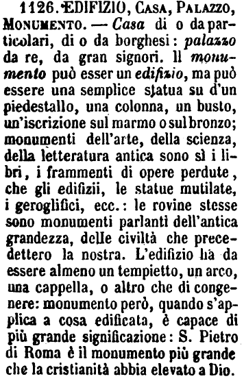 Edifizio, Casa, Palazzo, Monumento - Casa di o da particolari, di o da borghesi: palazzo da re, da gran signori. Il monumento può esser un edifizio, ma può essere una semplice statua su d'un piedestallo, una colonna, un busto, un'iscrizione sul marmo o sul bronzo; monumenti dell'arte, della scienza, della letteratura antica sono sì i libri, i frammenti di opere perdute, che gli edifizii, le statue mutilate, i geroglifici, ecc.: le rovine stesse sono monumenti parlanti dell'antica grandezza, delle civiltà che precedettero la nostra. L'edifizio ha da essere almeno un tempietto, un arco, una cappella, o altro che di congenere: monumento però, quando s'applica a cosa edificata, è capace di più grande significazione: S. Pietro di Roma è il monumento più grande che la cristianità abbia elevato a Dio. [immagine]