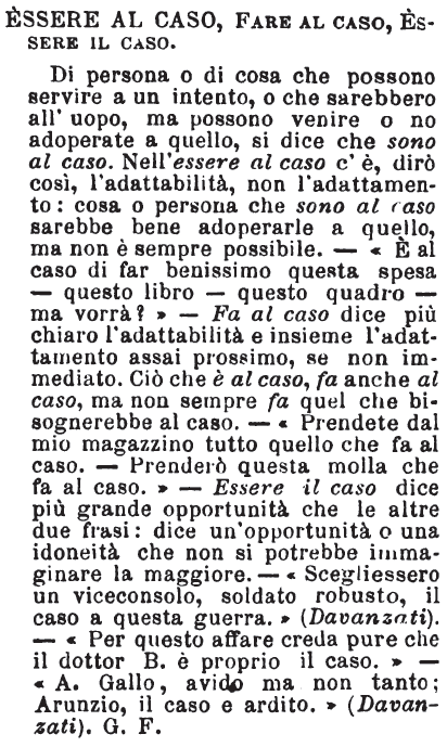 Essere al caso, Fare al caso, Essere il caso - Di persona o di cosa che possono servire a un intento, o che sarebbero all'uopo, ma possono venire o no adoperate a quello, si dice che sono al caso. Nell'essere al caso c'è, dirò così, l'adattabilità, non l'adattamento: cosa o persona che sono al caso sarebbe bene adoperarle a quello, ma non è sempre possibile. - «E' al caso di far benissimo questa spesa - questo libro - questo quadro - ma vorrà?» - Fa al caso dice più chiaro l'adattabilità e insieme l'adattamento assai prossimo, se non immediato. Ciò che è al caso, fa anche al caso, ma non sempre fa quel che bisognerebbe al caso. - «Prendete dal mio magazzino tutto quello che fa al caso. - Prenderò questa molla che fa al caso.» - Essere il caso dice più grande opportunità che le altre due frasi: dice un'opportunità o una idoneità che non si potrebbe immaginare la maggiore. - «Scegliessero un viceconsolo, soldato robusto, il caso a questa guerra.» (Davanzati). - «Per questo affare creda pure che il dottor B. è proprio il caso.» - «A. Gallo, avido ma non tanto; Arunzio, il caso e ardito.» (Davanzati). G.F. [immagine]