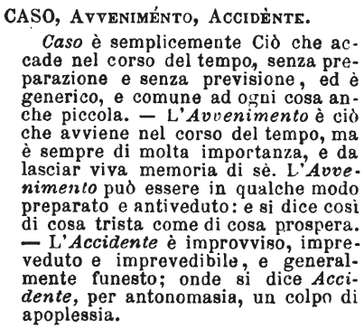 Caso, Avvenimento, Accidente - Caso è semplicemente Ciò che accade nel corso del tempo, senza preparazione e senza previsione, ed è generico, e comune ad ogni cosa anche piccola. - L'Avvenimento è ciò che avviene nel corso del tempo, ma è sempre di molta importanza, e da lasciar viva memoria di sè. L'Avvenimento può essere in qualche modo preparato e antiveduto: e si dice così di cosa trista come di cosa prospera. - L'Accidente è improvviso, impreveduto e imprevedibile, e generalmente funesto; onde si dice Accidente, per antonomasia, un colpo di apoplessia. [immagine]