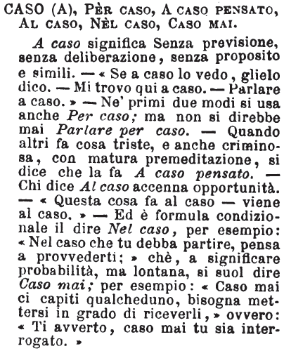 Caso, Per caso, A caso pensato, Al caso, Nel caso, Caso mai - A caso significa Senza previsione, senza deliberazione, senza proposito e simili. - «Se a caso lo vedo, glielo dico. - Mi trovo qui a caso. - Parlare a caso.» - Ne' primi due modi si usa anche Per caso; ma non si direbbe mai Parlare per caso. - Quando altri fa cosa triste, e anche criminosa, con matura premeditazione, si dice che la fa A caso pensato. - Chi dice Al caso accenna opportunità. - «Questa cosa fa al caso - viene al caso.» - Ed è formula condizionale il dire Nel caso, per esempio: «Nel caso che tu debba partire, pensa a provvederti;» chè, a significare probabilità, ma lontana, si suol dire Caso mai; per esempio: «Caso mai ci capiti qualcheduno, bisogna mettersi in grado di riceverli,» ovvero: «Ti avverto, caso mai tu sia interrogato.» [immagine]