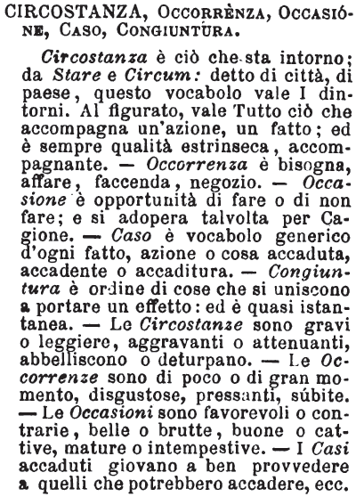 Circostanza, Occorrenza, Occasione, Caso, Congiuntura - Circostanza è ciò che sta intorno; da Stare e Circum: detto di città, di paese, questo vocabolo vale I dintorni. Al figurato, vale Tutto ciò che accompagna un'azione, un fatto; ed è sempre qualità estrinseca, accompagnante. - Occorrenza è bisogna, affare, faccenda, negozio. - Occasione è opportunità di fare o di non fare; e si adopera talvolta per Cagione. - Caso è vocabolo generico d'ogni fatto, azione o cosa accaduta, accadente o accaditura. - Congiuntura è ordine di cose che si uniscono a portare un effetto: ed è quasi istantanea. - Le Circostanze sono gravi o leggiere, aggravanti o attenuanti, abbelliscono o deturpano. - Le Occorrenze sono si poco o di gran momento, disgustose, pressanti, súbite. - Le Occasioni sono favorevoli o contrarie, belle o brutte, buone o cattive, mature o intempestive. - I Casi accaduti giovano a ben provvedere a quelli che potrebbero accadere, ecc. [immagine]