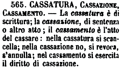 | Cassatura, Cassazione, Cassamento - La cassatura è di scrittura; la cassazione, di sentenza o altro atto; il cassamento è l'atto del cassare: nella cassatura si scancella; nella cassazione no, si revoca, s'annulla; nel cassamento si esercita il diritto di cassazione. [immagine] |