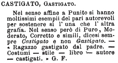 Castigato, Gastigato - Nel senso affine a Punito si hanno moltissimi esempii del pari autorevoli per sostenere si l'una che l'altra grafia. Nel senso però di Puro, Moderato, Corretto e simili, dicesi sempre Castigato e non Gastigato. - « Ragazzo gastigato dal padre. - Costumi - stile- libro - autore - castigati. » G. F. [immagine]