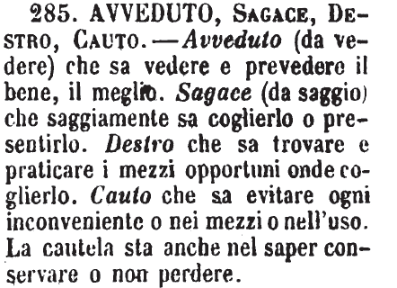 Avveduto, Sagace, Destro, Cauto - Avveduto (da vedere) che sa vedere e prevedere il bene, il meglio. Sagace (da saggio) che saggiamente sa coglierlo o presentirlo. Destro che sa trovare e praticare i mezzi opportuni onde coglierlo. Cauto che sa evitare ogni inconveniente o nei mezzi o nell'uso. La cautela sta anche nel saper conservare o non perdere. [immagine]