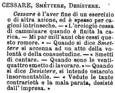 | Cessare, Smettere, Desistere - Cessare è l'aver fine di un esercizio o di altra azione, ed è spesso per cagioni intrinseche. - «L'orologio cessa di camminare quando è finita la carica. - Mi par mill'anni che cessi questo romore.» - Quando si dice Smettere si accenna ad un atto della volontà o della consuetudine. - «Smetti di cantare. - Quando sono le ventiquattro smetto di lavorare.» - Quando si dice Desistere, si intende ostacolo insormontabile. - «Vedute le tante contrarietà e la mala parata, desistè dall'impresa.» [immagine] |