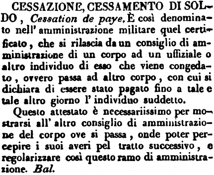 Cessazione, Cessamento di soldo - Cessation de paye. È così denominato nell'amministrazione militare quel certificato, che si rilascia da un consiglio di amministrazione di un corpo ad un uffiziale o altro individuo di esso che viene congedato, ovvero passa ad altro corpo, con cui si dichiara di essere stato pagato fino a tale e tale altro giorno l'individuo suddetto.