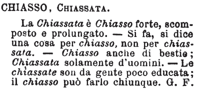 Chiasso, Chiassata - La Chiassata è Chiasso forte, scomposto e prolungato. - Si fa, si dice una cosa per chiasso, non per chiassata. - Chiasso anche di bestie; Chiassata solamente d'uomini. - Le chiassate son da gente poco educata; il chiasso può farlo chiunque. G. F. [immagine]