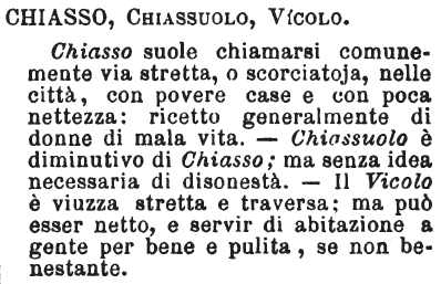 Chiasso, Chiassuolo, Vicolo - Chiasso suole chiamarsi comunemente via stretta, o scorciatoja, nelle città, con povere case e con poca nettezza: ricetto generalmente di donne di mala vita. - Chiassuolo è diminutivo di Chiasso; ma senza idea necessaria di disonestà. - Il Vicolo è viuzza stretta e traversa; ma può esser netto, e servir di abitazione a gente per bene e pulita, se non benestante. [immagine]