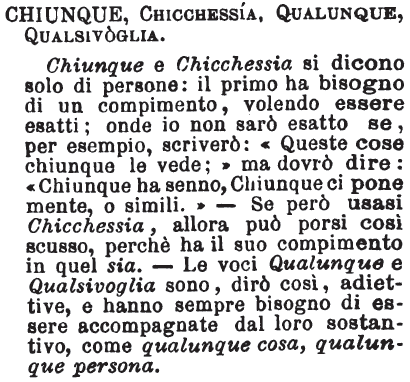 | Chiunque, Chicchessia, Qualunque, Qualsivoglia - Chiunque e Chicchessia si dicono solo di persone: il primo ha bisogno di un compimento, volendo essere esatti; onde io non sarò esatto se, per esempio, scriverò: «Queste cose chiunque le vede;» ma dovrò dire: «Chiunque ha senno, Chiunque ci pone mente, o simili.» - Se però usasi Chicchessia, allora può porsi così scusso, perchè ha il suo compimento in quel sia. - Le voci Qualunque e Qualsivoglia sono, dirò così, adiettive, e hanno sempre bisogno di essere accompagnate dal loro sostantivo, come qualunque cosa, qualunque persona. [immagine] |