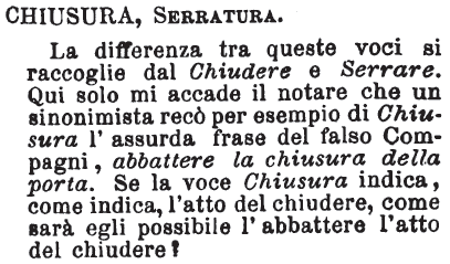 | Chiusura, Serratura - La differenza tra queste voci si raccoglie dal Chiudere e Serrare. Qui solo mi accade il notare che un sinonimista recò per esempio di Chiusura l'assurda frase del falso Compagni, abbattere la chiusura della porta. Se la voce Chiusura indica, come indica, l'atto del chiudere, come sarà egli possibile l'abbattere l'atto del chiudere? [immagine] |