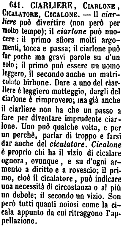 Ciarliere, Ciarlone, Cicalatore, Cicalone - Il ciarliere può divertire (non però per molto tempo); il ciarlone può nuocere: il primo sfiora molti argomenti, tocca e passa; il ciarlone può far poche ma gravi parole su d'un solo; il primo può essere un uomo leggero, il secondo anche un matricolato birbone. Dare a uno del ciarliere è leggiero motteggio, dargli del ciarlone è rimprovero; ma già anche il ciarliere non ha che un passo a fare per diventare imprudente ciarlone. Uno può qualche volta, e per un perchè, parlar di troppo e farsi dar anche del cicalatore. Cicalone è proprio chi ha il vizio di cicalare ognora, ovunque, e su d'ogni armento a diritto e a rovescio; il primo, cioè il cicalatore, può indicare una necessità di circostanza o al più un debole; il secondo un vizio. Son però tutti quanti noiosi come la cicala appunto da cui ritraggono l'appellazione. [immagine]