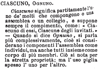 Ciascuno, Ognuno - Ciascuno significa partitamente l'uno de' molti che compongono o una assemblea o un collegio, e suppone sempre il compimento, come: « Ciascuno di essi, Ciascuno degli invitati. » - Quando si dice Ognuno, si parla più complessivamente, cioè si considerano i componenti l'assemblea come individui, ma anche tutti insieme come corpo di più membri. Ciò si nota per la stretta proprietà; ma l'uso piglia spesso l'uno per l'altro. [immagine]