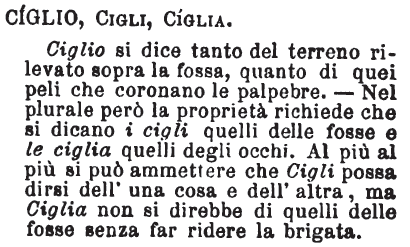 Ciglio, Cigli, Ciglia - Ciglio si dice tanto del terreno rilevato sopra la fossa, quanto di quei peli che coronano le palpebre. - Nel plurale però la proprietà richiede che si dicano i cigli quelli delle fosse e le ciglia quelli degli occhi. Al più al più si può ammettere che Cigli possa dirsi dell'una cosa e dell'altra, ma Ciglia non si direbbe di quelli delle fosse senza far ridere la brigata. [immagine]