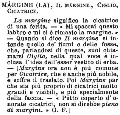 Margine (la), Il margine, Ciglio, Cicatrice - La margine significa la cicatrice di una ferita. - «Mi spaccai questo labbro e mi ci è rimasto la margine.» - Quando si dice Il margine si intende quello de' fiumi e delle fosse, che, parlandosi di queste, suol chiamarsi Ciglio, nella qual voce è inclusa l'idea dell'esser vestito di erba. - [Margine ora non è più comune per Cicatrice, che è anche più nobile, e soffre il traslato. Poi Margine par che sia più proprio di cicatrici molto grandi e visibili, e più specialmente della faccia. - «Petto coperto d'onorate cicatrici, non si direbbe pieno di margini.» G. F.] [immagine]