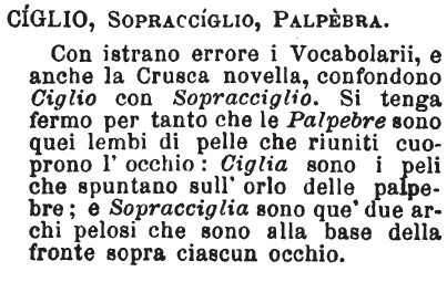 Ciglio, Sopracciglio, Palpebra - Con istrano errore i Vocabolarii, e anche la Crusca novella, confondono Ciglio con Sopracciglio. Si tenga fermo per tanto che le Palpebre sono quei lembi di pelle che riuniti cuoprono l'occhio: Ciglia sono i peli che spuntano sull'orlo delle palpebre; e Sopracciglia sono que' due archi pelosi che sono alla base della fronte sopra ciascun occhio. [immagine]